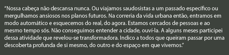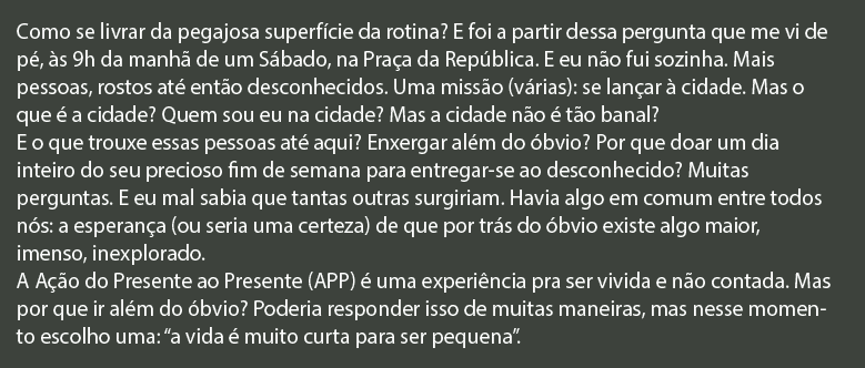 A APP é uma experiência de desvios, acontecimentos e desacontecimentos, de reapropriação do território da cidade e de si mesmo. Uma provocação para que um olhar mais atento aos cenários atuais sejam permitidos. A dinâmica do dia só é revelada no ato dos encontros.